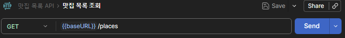 위에서 만든 콜렉션에 Request를 새로 만들어서 GET Method를 baseURL(MockServerURL)/places에게 요청할 준비를 하였습니다.