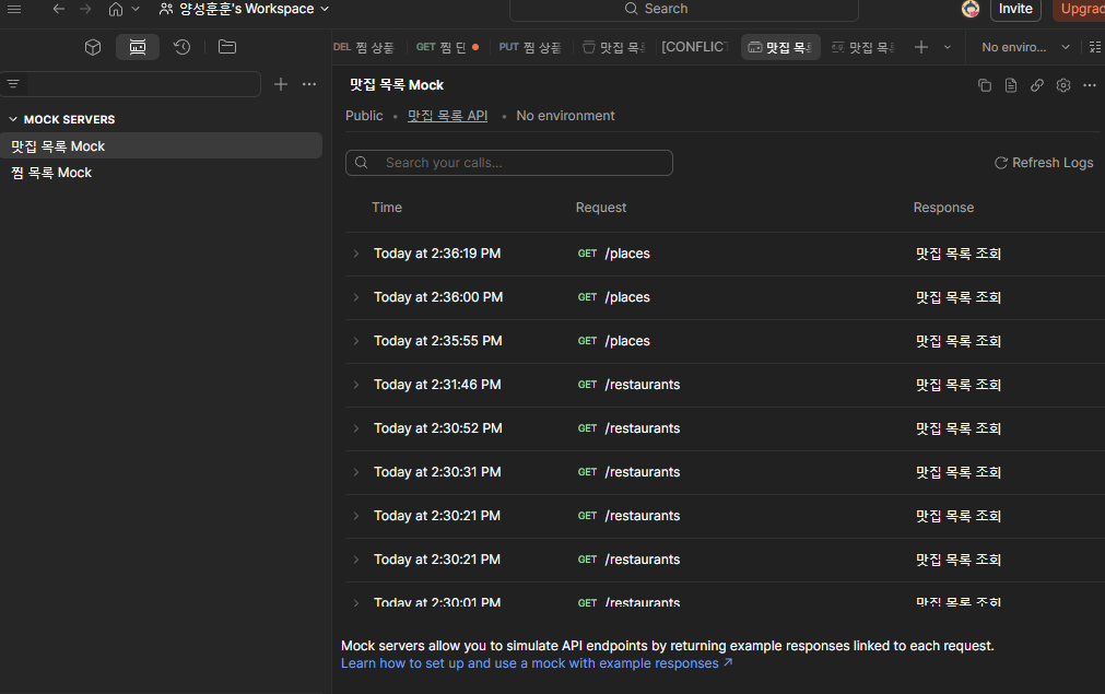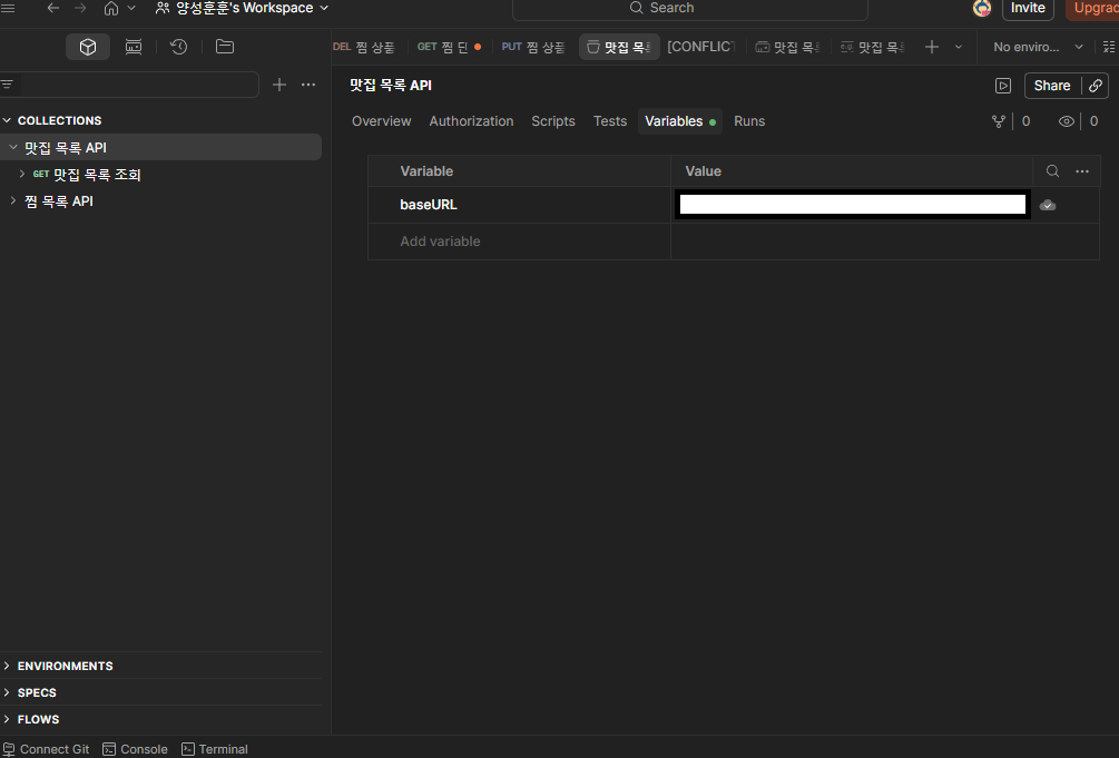 이후 생성한 콜렉션에 baseURL이라는 변수를 만들어 Mock Server 주소를 넣어줬습니다.