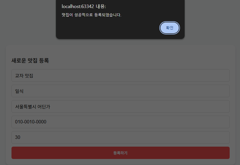교자 맛집의 수정버튼을 클릭하였을때 이런식으로 맛집 등록 버튼이 수정 완료 버튼으로 바뀌며 내용이 폼으로 불러와집니다.