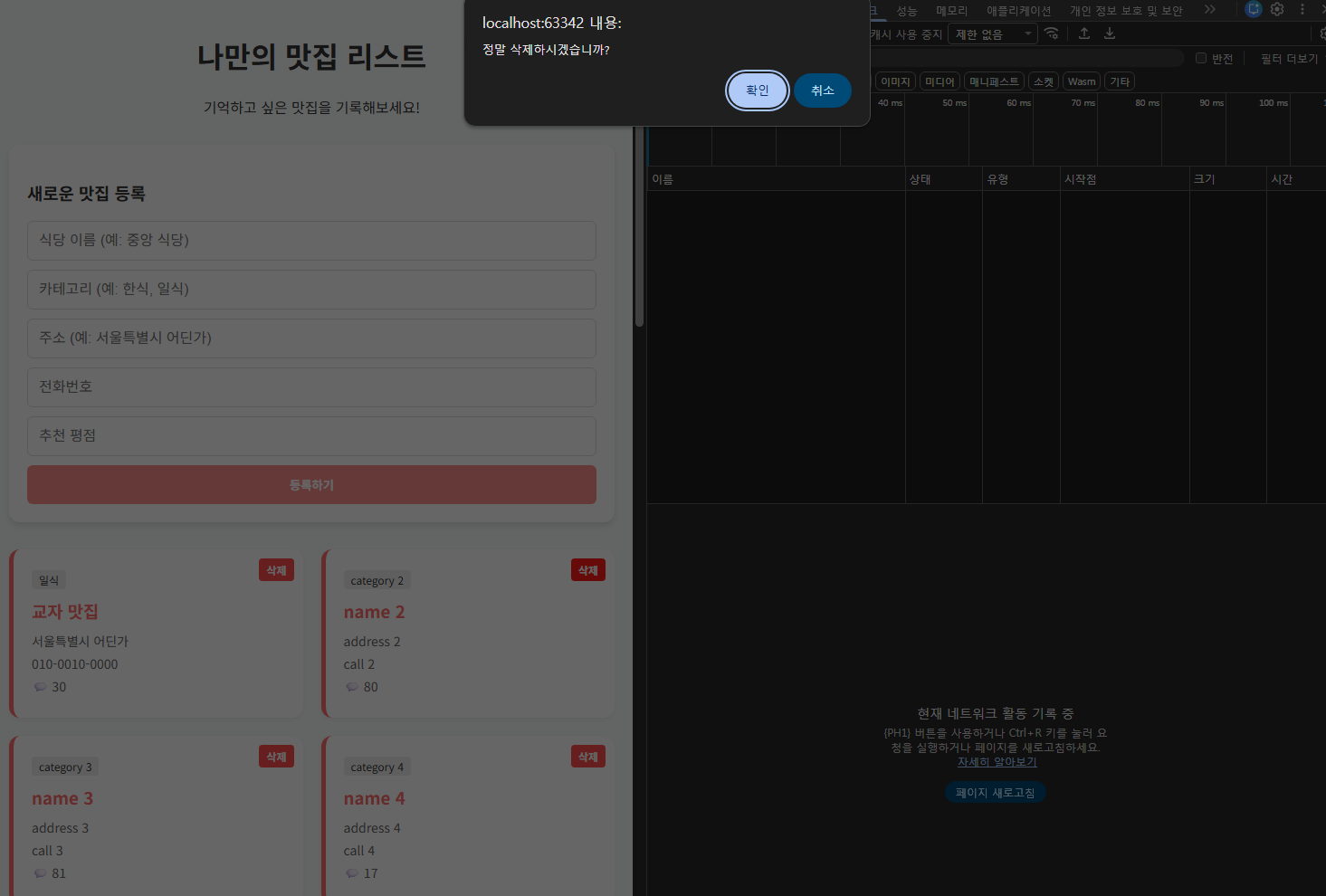 이후 수정 완료를 눌렀다면 resetForm 함수를 실행하여 폼에 채웠던 수정 내용을 지우고 fetchRestaurants 함수로 변경된 내용을 웹사이트에 있는 카드에 적용되도록 하였습니다.